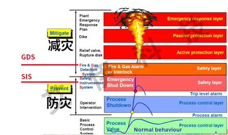 從圖中可以看出GDS系統是在氣體泄漏以后進行報警提醒,屬于減災層面,而SIS系統的緊急停車等系統更多屬于防災層面,二者并不屬于相同的安全保護層。同時當SIS系統故障時,更需要獨立的GDS系統發揮功能。