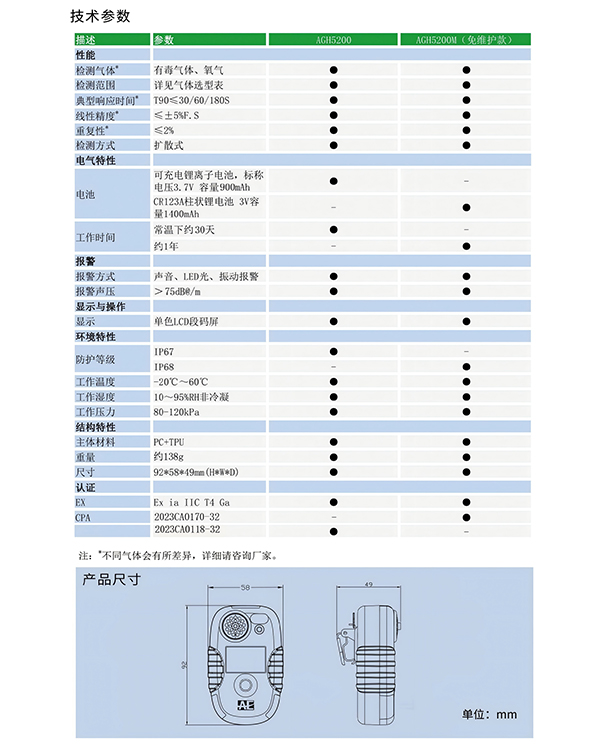 艾伊科技AGH5200、AGH5200M型便攜式氣體檢測報警儀可檢測環境中的氧氣、氣氣、氨氣、一氧化碳等有毒氣體。產品為全握式設計,體積小巧,內置電化學傳感器,響應迅速。本安防爆設計,AGH5200防護等級達IP67,AGH5200M防護等級達IP68,可適用于環境惡劣場所,雙層設計的外殼在保證握持手感的同時也能經受惡劣環境的考驗,同時,單鍵操作大大減少誤操作可能。