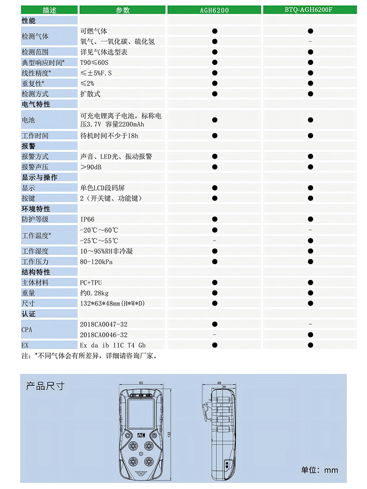 AGH6200型檢測儀為標(biāo)準(zhǔn)四合一氣體檢測報警儀,產(chǎn)品可同時檢測可燃?xì)狻⒀鯕狻⒁谎趸己土蚧瘹涞臐舛戎担?dāng)環(huán)境中相應(yīng)氣體濃度超過安全界限時,自動聲、光、震動報警提醒工作人員。