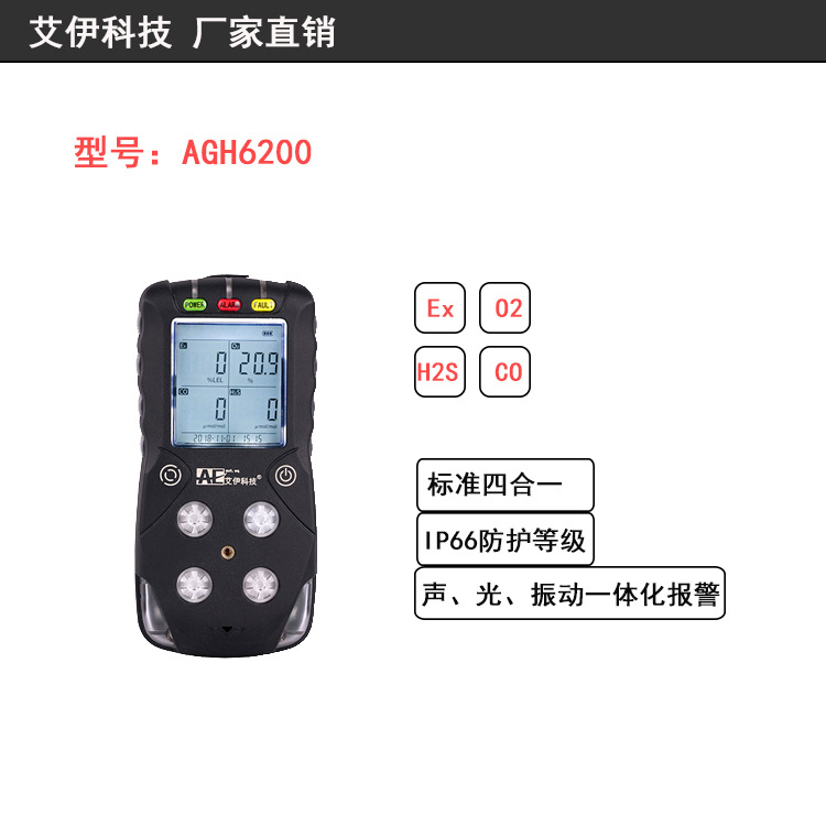 艾伊科技AGH6200型便攜式氣體檢測報警儀為標準四合一氣體檢測報警儀,產品可同時檢測可燃氣體、氧氣、一氧化碳和僑化氫的濃度值,當環境中相應氣體濃度超過安全界限時,自動盧、光、振動報警提醒工作人員。